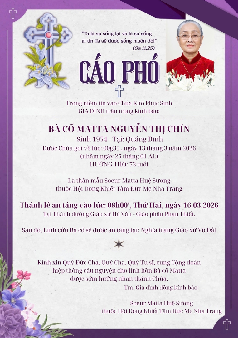 Sinh năm: 1954 - Tại: Quảng Bình. Được Chúa gọi về lúc: 00g35 , ngày 13 tháng 3 năm 2026 ( nhằm ngày 25 tháng 01 AL)
