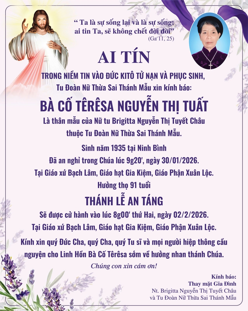 Cáo Phó Bà Cố Têrêsa Nguyễn Thị Tuất - Thân Mẫu Nữ Tu Brigitta Nguyễn Thị Tuyết Châu