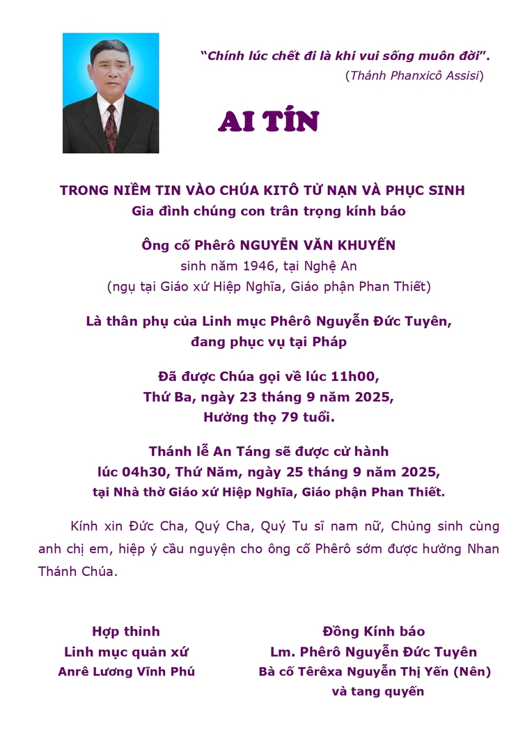Cáo phó Ông cố Phêrô NGUYỄN VĂN KHUYẾN