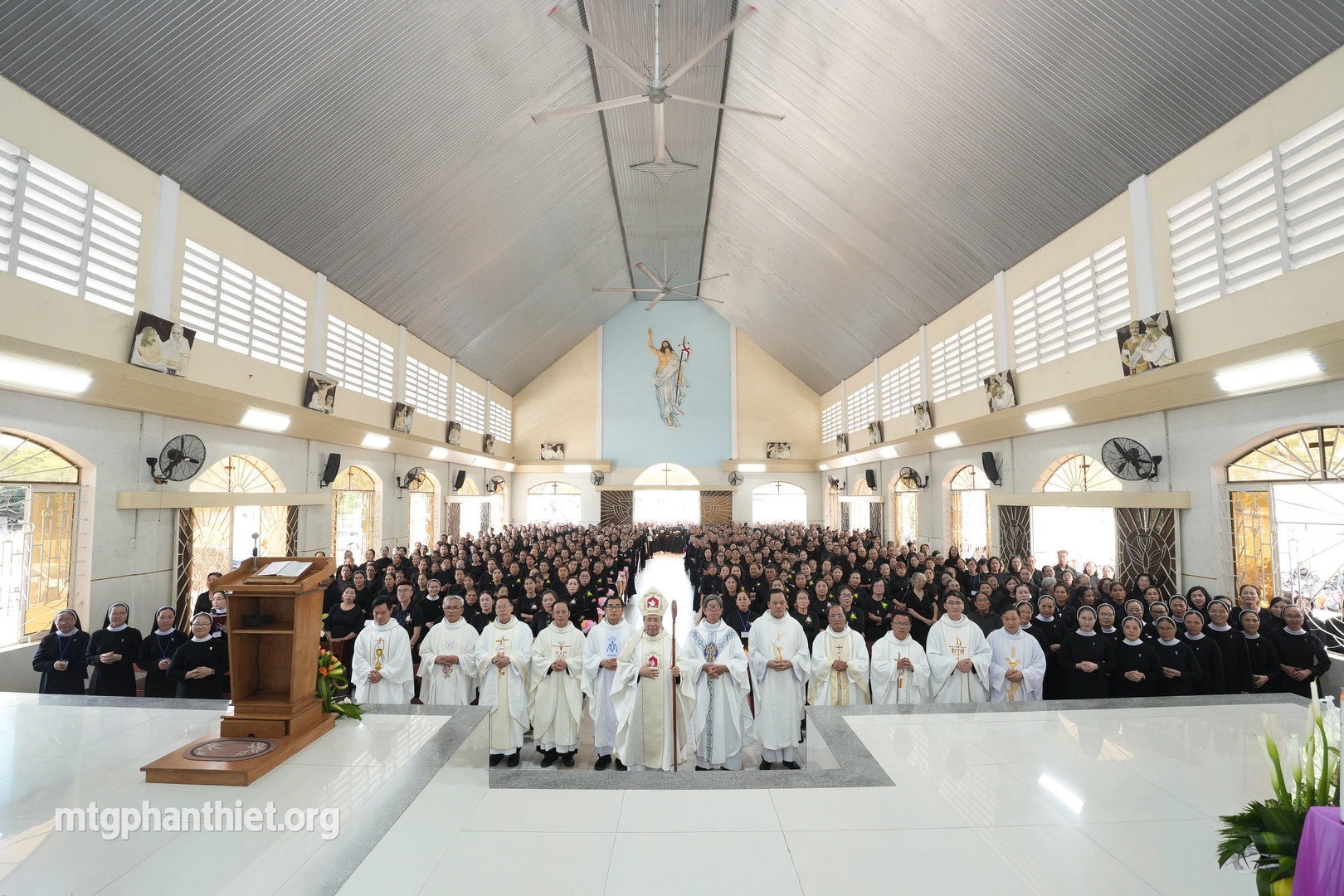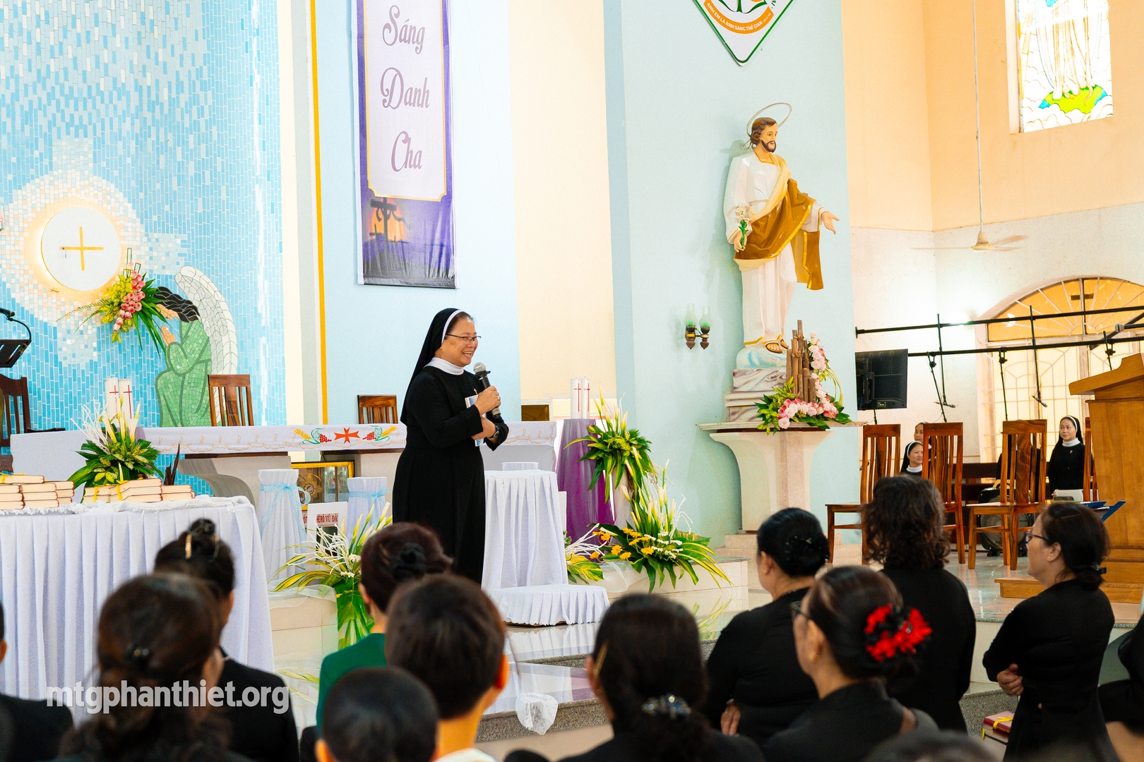 Thánh lễ tạ ơn do Đức cha Giuse Đỗ Mạnh Hùng – Giám mục Giáo phận Phan Thiết – chủ tế. Đồng tế với ngài có cha Gioan Trần Lữ Đô – Linh hướng Hiệp hội, cha Giuse Đặng Văn Nam – nguyên Linh hướng Hiệp hội và quý cha. Hiện diện trong ngày gặp gỡ còn có quý thầy, Sơ Tổng Phụ trách Maria Têrêsa Hoàng Thị Ngọc cùng quý sơ Hội dòng Mến Thánh Giá Phan Thiết.