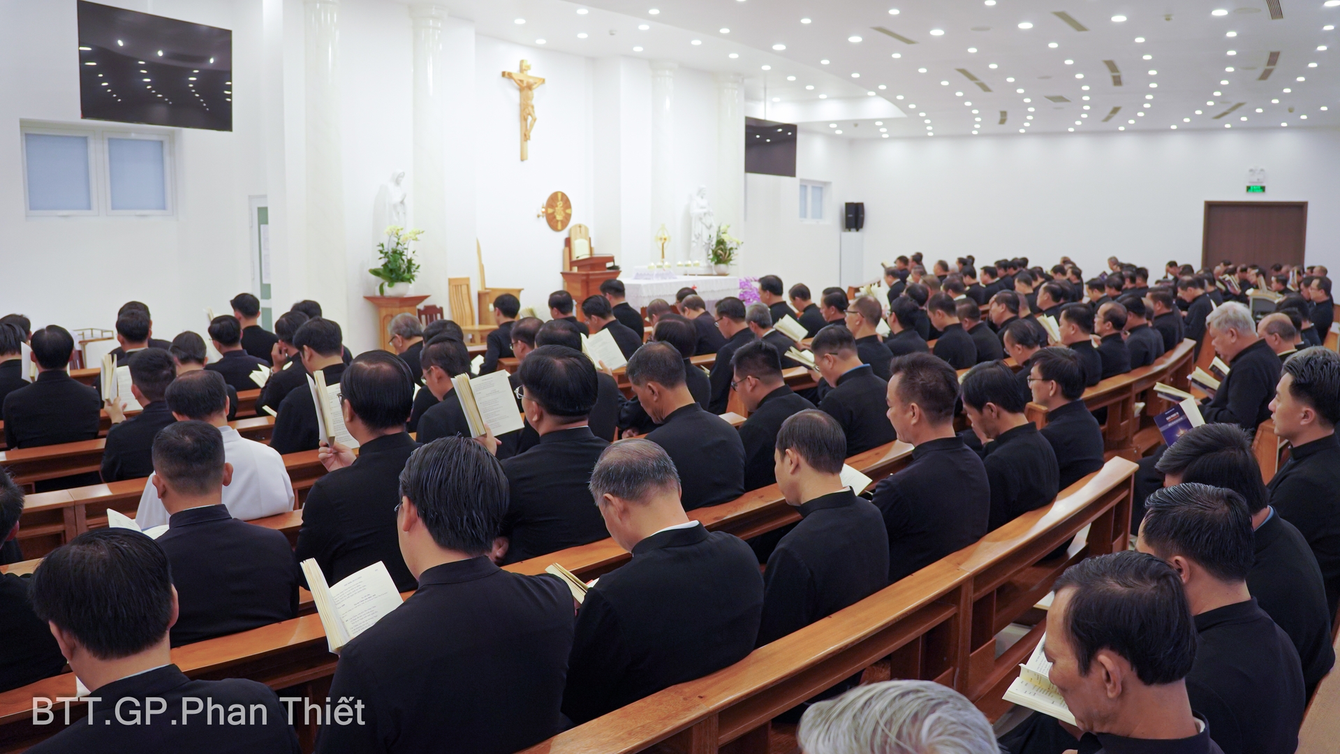 Ngày tĩnh tâm thứ tư trong tuần tĩnh năm của Linh mục Đoàn Giáo phận Phan Thiết khởi đầu bằng giờ kinh sáng và Thánh lễ với ý hướng xin ơn thánh hóa các Linh mục. Xin cho các Linh mục được ơn trung thành, hiệp ý cầu nguyện cho các tu sĩ, xin cho có nhiều người quảng đại đáp lại lời mời gọi của Chúa sống đời dâng hiến. Trong bài giảng lễ, Đức cha Giuse giảng phòng chia sẻ tâm tình những ngày cuối của năm phụng vụ là hãy tỉnh thức và sống giây phút hiện tại. Chúa Giêsu đã khóc thương thành Giêrusalem, bởi vì họ đã từ chối đón nhận ơn cứu độ của Chúa. Ngày nay Chúa vẫn khóc vì nhân loại vẫn thờ ơ và không muốn đón nhận ơn cứu độ, “Người đã đến nhà mình, nhưng các gia nhân đã không đón nhận Người”. Kết thúc bài giảng lễ, Đức cha Giuse giảng phòng mời gọi các linh mục hãy có trái tim của Chúa, biết khóc thương trước sự thờ ơ của con người, hãy dâng Thánh lễ hôm nay để đền tội, xin ơn phó thác và trung thành. Xin cho cuộc đời của các Linh mục trổ sinh hoa trái để đem lại ơn ích cho mình, cho con người và cho cuộc đời.