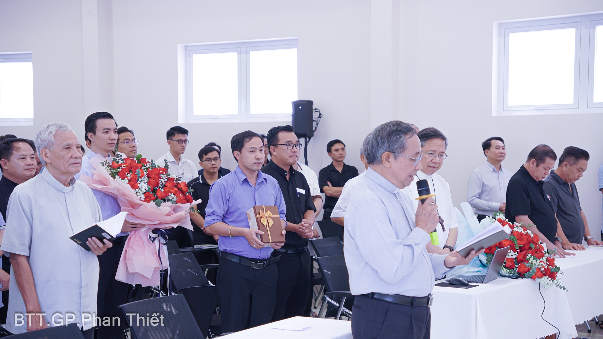 Sau giờ chia sẻ buổi chiều, Cha Tổng đại diện thay mặt linh mục đoàn Giáo phận bày tỏ tâm tình đến Đức Cha Giáo phận với lời chúc nhân ngày nhà giáo Việt Nam, gửi lời Chúc đến Đức Cha là vị cha chung giáo phận và là Thầy dạy đức tin. Tiếp đó cha Tổng Đại Diện tri ân đến Đức Cha Giuse giảng phòng. Ngài gợi lại tâm tình và những bài chia sẻ mà Đức Cha gửi đến anh em Linh mục Giáo phận Phan Thiết trong tuần tĩnh tâm. Đức Cha giúp Linh mục Đoàn giáo phận Phan Thiết nhìn lại và làm mới đời sống Linh mục của mình, những tâm tình chia sẻ thật đơn sơ và những cảm nghiệm trong đời dâng hiến của Đức Cha giúp Linh mục Đoàn Giáo phận sống lại Hồng Ân Ơn Gọi Linh Mục như chủ đề của tuần tĩnh tâm năm nay gợi lên.