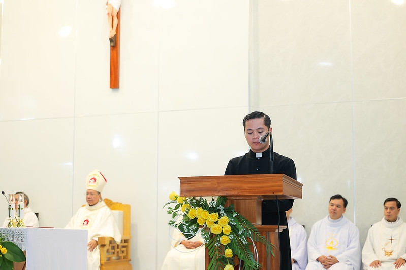 Thánh lễ do Đức Cha Giuse chủ tế được tiếp nối ngay sau giờ cầu nguyện. Đồng tế với Đức cha có cha Gioan Baotixita Trần Văn Thuyết – Tổng Đại diện, cha Gioan Trần Văn Thức – Giám đốc Chủng viện Nicolas và quý cha trong giáo phận. Ngỏ lời đầu lễ, Đức cha Giuse mời gọi cộng đoàn cùng hiệp ý với các linh mục hưu dưỡng và cộng đoàn tín hữu, để tôn vinh Thánh Cả Giuse – người cha thinh lặng nhưng đầy can đảm.