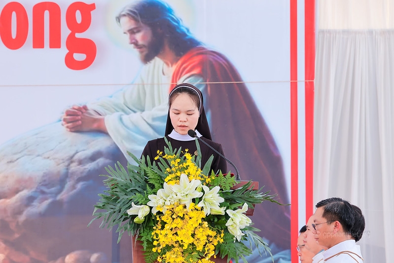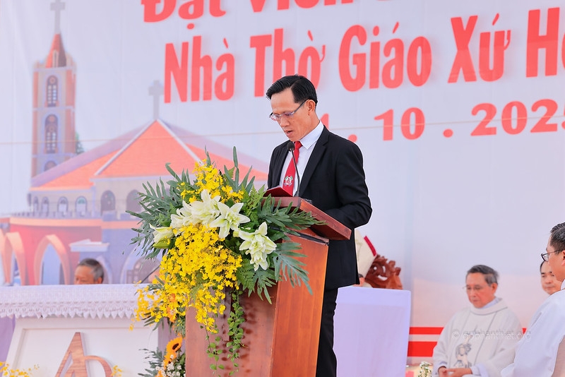 Sau lời nguyện hiệp lễ, đại diện Giáo xứ bày tỏ tâm tình tri ân sâu sắc đến Đức Cha Giuse, quý Cha, quý Tu sĩ và toàn thể quý ân nhân xa gần đã quảng đại góp công, góp của và lời cầu nguyện cho Giáo xứ Hòa Đông được như ngày hôm nay.