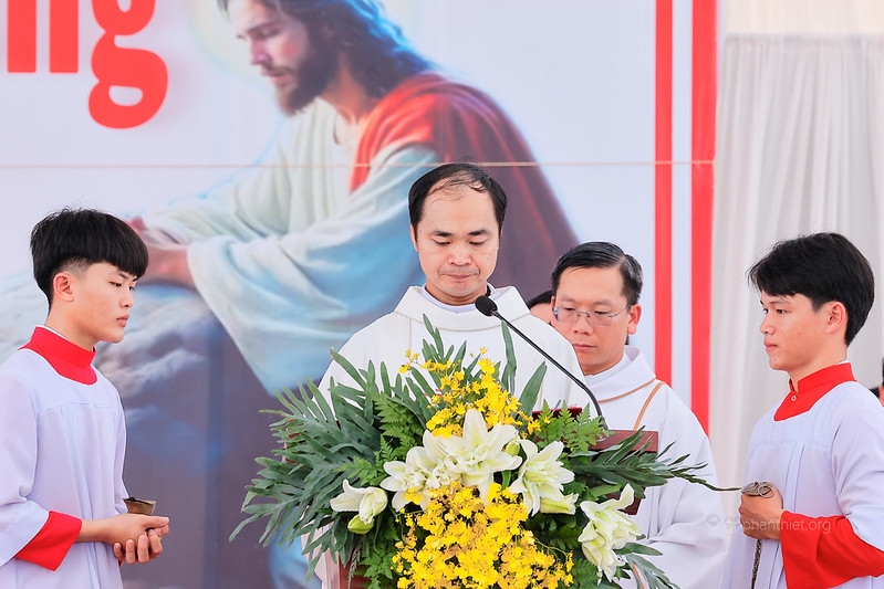 Thánh Lễ được cử hành vào lúc 09 giờ tại khuôn viên mảnh đất xây dựng mới do Đức Cha Giuse Đỗ Mạnh Hùng - Giám mục Giáo phận Phan Thiết chủ tế. Đồng tế với ngài có cha Gioan Baotixita – Tổng đại diện Giáo phận Phan Thiết, quý Cha trong và ngoài Giáo phận. Tham dự Thánh Lễ có đông đảo quý Tu sĩ nam nữ, quý ân nhân xa gần, quý khách và toàn thể cộng đoàn dân Chúa Giáo xứ Hòa Đông.