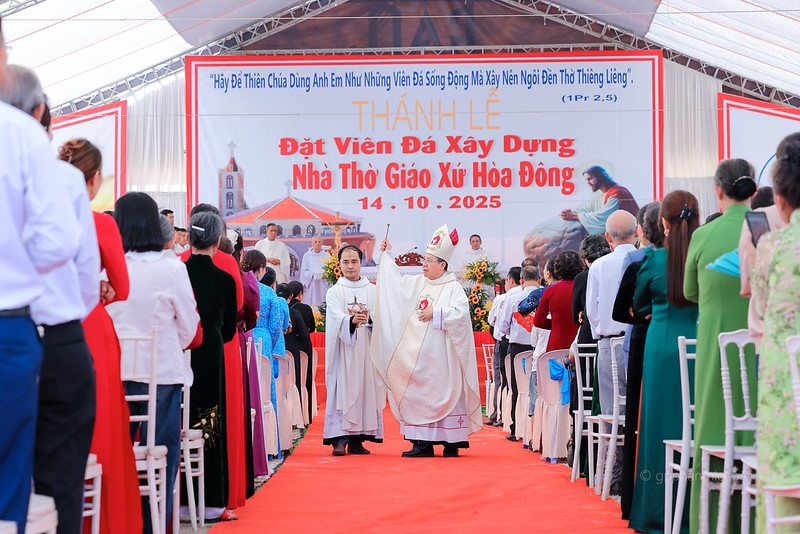 GPPT – 14/10/2025, ngay từ sáng sớm dòng người từ khắp nơi đổ về khuôn viên mảnh đất mới xây dựng nhà thờ Giáo xứ Hòa Đông, tạo nên một bầu không khí náo nức, vui tươi nhưng không kém phần trang nghiêm. Những nụ cười rạng rỡ, những cái bắt tay mừng vui thể hiện niềm hân hoan của cộng đoàn khi chứng kiến giấc mơ xây dựng ngôi thánh đường mới sắp thành hiện thực. Đây là một biến cố lịch sử, đánh dấu sự khởi đầu của một công trình vật chất mà từ lâu đã là niềm mong ước của bao thế hệ giáo dân, đồng thời là một bước tiến quan trọng trong hành trình đức tin của Giáo xứ.