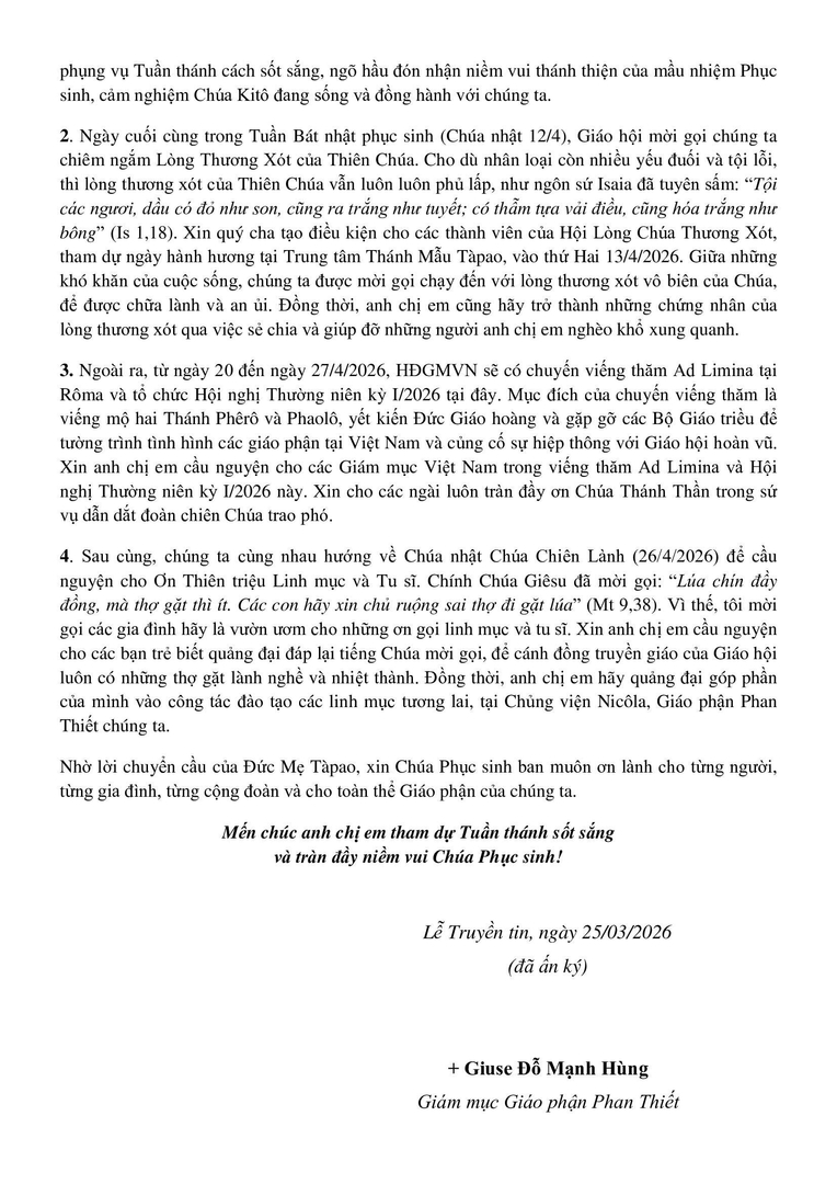 WGPPT Ngày 25/03/2026, Đức cha Giuse Đỗ Mạnh Hùng có Thư Mục Vụ 04/2026 gửi cộng đoàn Dân Chúa Giáo phận Phan Thiết. Sau đây là video nội dung Thư Mục Vụ của Đức Cha Giuse.