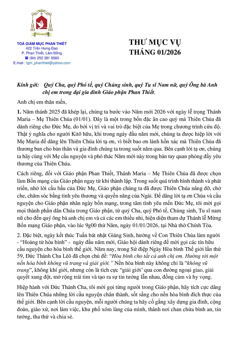 Thư Mục Vụ Tháng 1 Năm 2026 - Giáo phận Phan Thiết